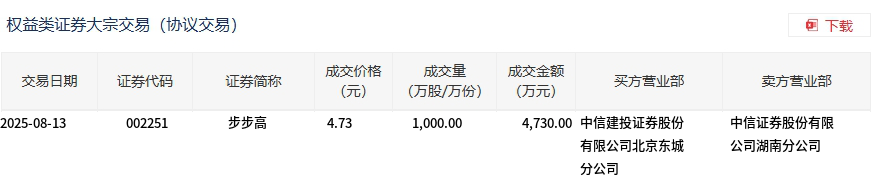 8月13日,步步高大宗交易成交1000万股,成交额4730万元,占当日总成交额的6.68%,成交价4.73元,较市场收盘价4.86元折价2.67%。