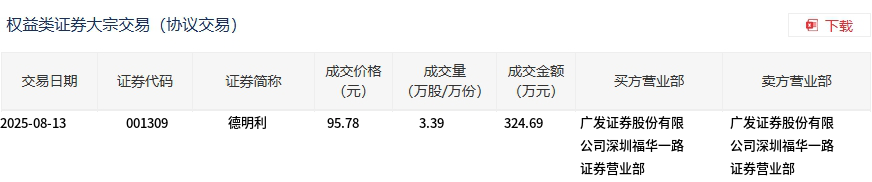 8月13日,德明利大宗交易成交3.39万股,成交额324.69万元,占当日总成交额的0.37%,成交价95.78元,较市场收盘价93.84元溢价2.07%。
