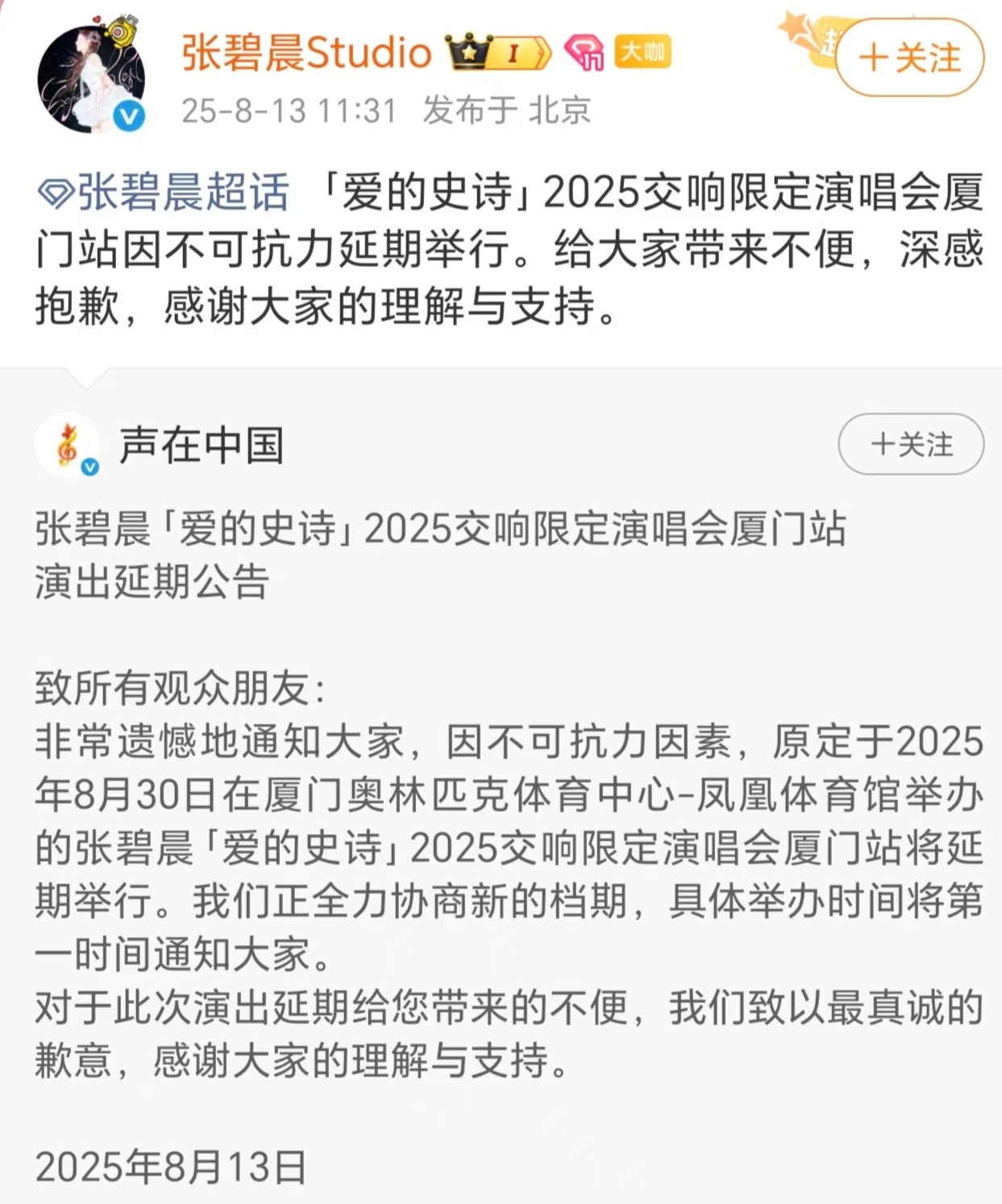8月13日, “声在中国”微博官方账号发文称,因不可抗力因素,原定于2025年8月30日在厦门奥林匹克体育中心-凤凰体育馆举办的张碧晨“爱的史诗”2025交响限定演唱会厦门站将延期举行。“我们正全力协商新的档期,具体举办时间将第一时间通知大家”。