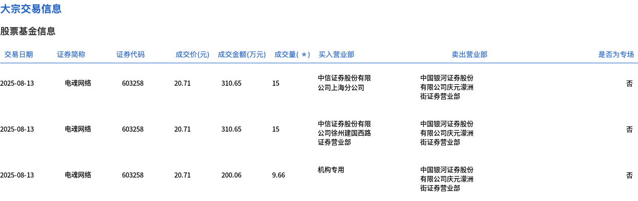 8月13日,电魂网络大宗交易成交49.32万股,成交额1021.42万元,占当日总成交额的8.79%,成交价20.71元,较市场收盘价22.99元折价9.92%。