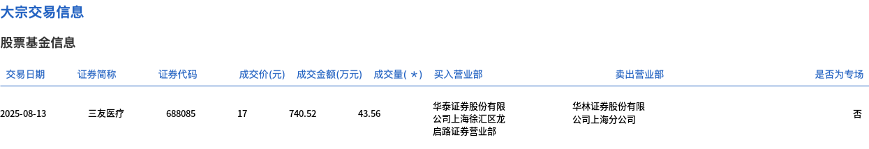 8月13日,三友医疗大宗交易成交43.56万股,成交额740.52万元,占当日总成交额的6.13%,成交价17元,较市场收盘价21.52元折价21%。