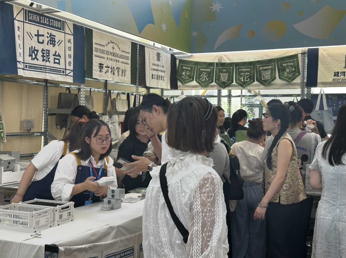 今年书展的特点之一是,几乎所有展位都有衍生的文创商品,它们被摆在品牌的展区门口,和集章小桌子并置,成了人流最拥堵密集的地方。文创产品的设计思路往往与出版社历史与旗下书籍有关,人民教育出版社把学生课本内出现频率较高的鲁迅和李雷韩梅梅制成文创ip;上海译文出版社文创“七海制造局”,图案设计多取自一套弗吉尼亚·伍尔夫系列书籍的书封。今年他们把文创售卖范围扩大到三四排货架,中午时间放眼望去已经被围了个水泄不通。