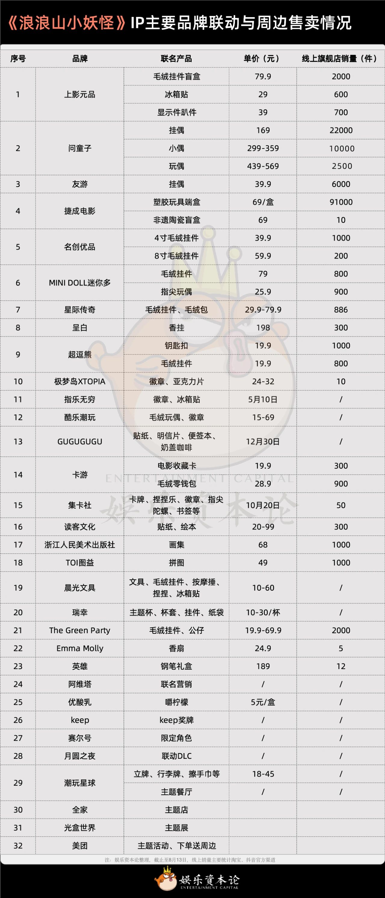 据娱乐资本论统计,浪浪山联名的32个品牌中,18个是潮玩、周边类品牌,4家生活消费品牌,2个出版类,2款游戏,还涉及到汽车、app、主题展陈等。