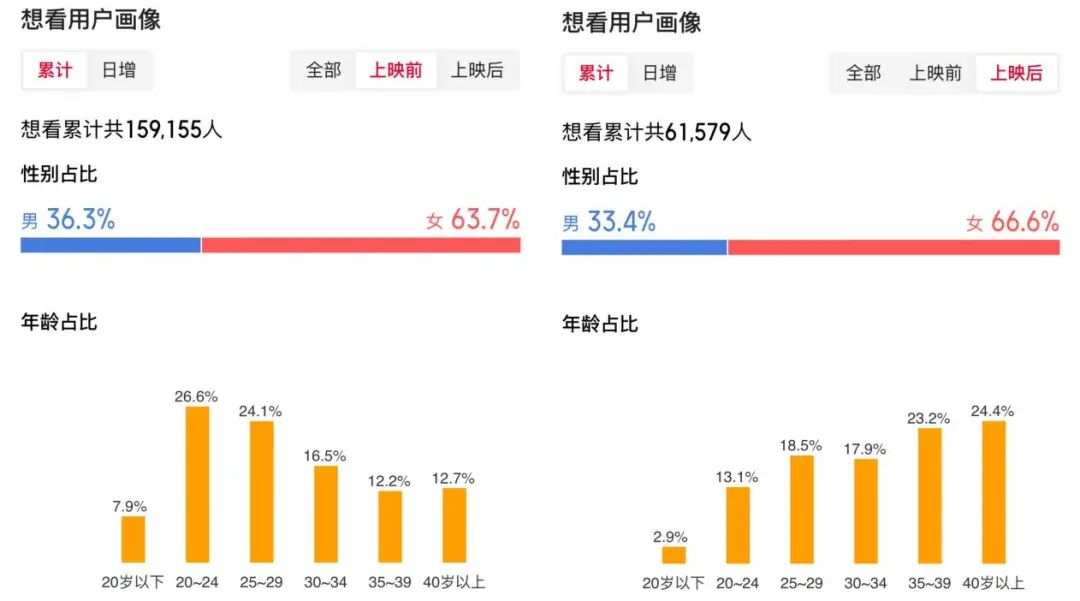 从猫眼想看数据来看,《浪浪山小妖怪》上映前以年轻受众为主,29岁以下用户占六成,20岁以下有7.9%,20-29岁为主力军,符合年轻打工人画像。上映后的想看画像明显向更高年龄层迁移,30岁以上占65%以上,35岁以上用户为主力,亲子用户更多,观众画像逐渐延展到全年龄层。