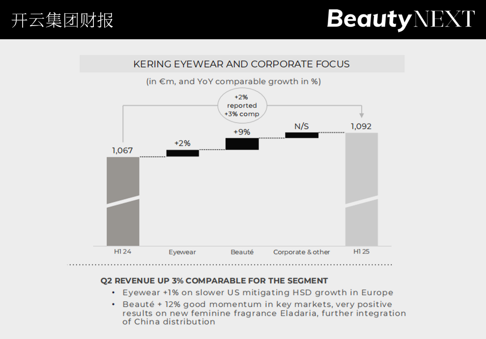 在奢侈品大环境不好的情况下,美妆和眼镜成为了两个最能出业绩的板块。今年上半年,开云眼镜和企业部门(包括开云美妆)的总收入为11亿欧元(人民币约91.23亿元),按报告增长2%,按可比增长3%。
