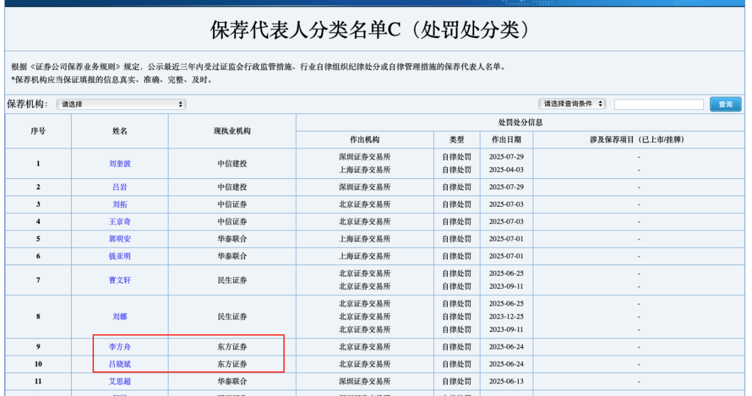 值得注意的是,2025年7月,中国证券业协会发布的保荐代表人分类名单显示,东方证券保荐代表人李方舟、吕晓斌因在大鹏工业IPO项目中履职违规,被北交所采取自律监管措施。