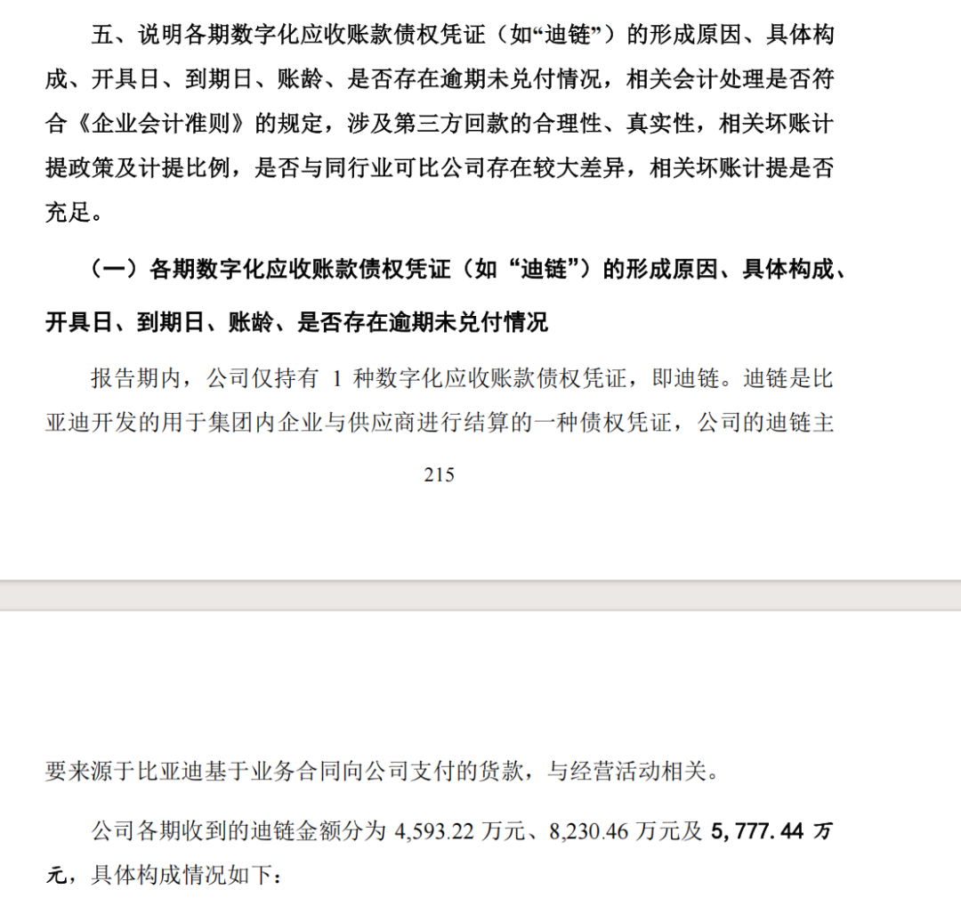 大鹏工业回复称,报告期内,公司仅持有1种数字化应收账款凭证,即迪链。2021年至2023年,公司收到的迪链金额分别为4593.22万元、8230.46万元及5777.44万元。报告期内,不存在逾期兑付的情况。与迪链相关的会计处理符合《企业会计准则》的规定。