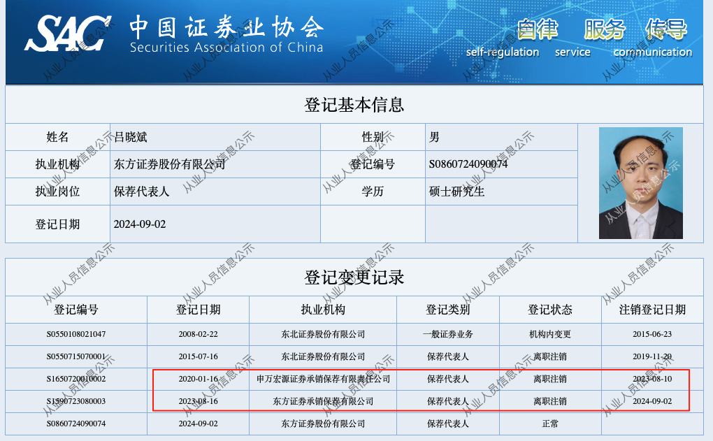 这背后是“项目随人走”的情况。保代吕晓斌的履历显示,其2020年1月在申万宏源时保荐大鹏工业创业板IPO,2023年6月东方证券接手后,他8月就跳槽到东方证券继续保荐这个项目。