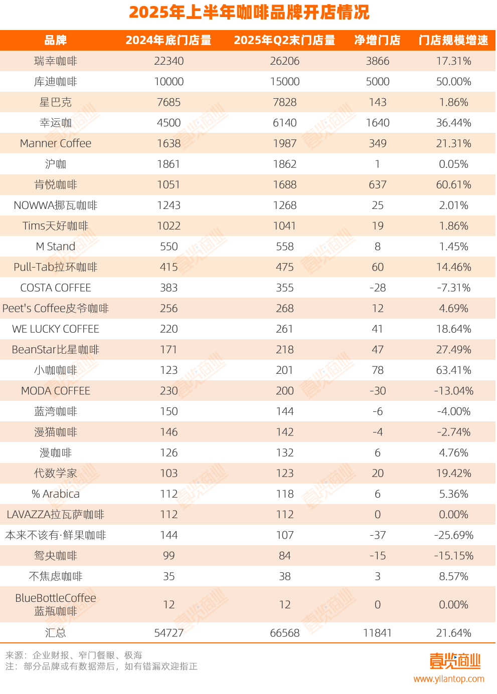 2025年上半年,壹览商业长期跟踪的27家连锁咖啡品牌门店存量达66568家,净增门店11841家,较2024年底,增长了21.64%,行业正式迈入新一轮扩张周期。