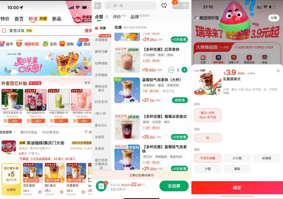 外卖大战的背景下,库迪和京东合作,将咖啡价格打到5.9元;星巴克在外卖平台上也能以不到三十元的价格拿下两杯;瑞幸上线拼好饭,部分产品降至8.9元甚至更低。