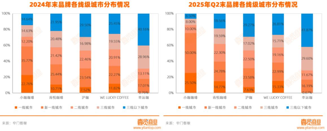 以肯悦、沪咖、小咖咖啡、WE LUCKY COFFEE为代表,客单价约15元左右的平价品牌,在一、二线城市的门店占比显著提升,其中,小咖咖啡占比提升了近15个百分点。