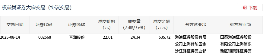 8月14日,百润股份大宗交易成交24.34万股,成交额535.72万元,占当日总成交额的1.78%,成交价22.01元,较市场收盘价24.67元折价10.78%。