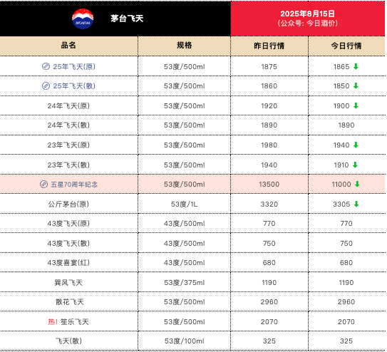 今日酒价披露的批发参考价显示,8月15日,25年飞天茅台原箱较前一日下跌10元,报1865元/瓶;25年飞天茅台散瓶较前一日下跌10元,报1850元/瓶。24年飞天茅台原箱较前一日下跌20元,报1900元/瓶。23年飞天茅台原箱较前一日下跌40元,报1940元/瓶。