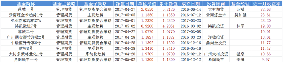 排名第二的“云南炼金术趋势一号”属于云南炼金术旗下的期货产品,四月份收益率为23.61%,最新净值为1.1350。该产品在去年四季度表现不佳,产品又加大回撤,最低净值跌至0.845。今年以来,产品表现出单边上扬格局,月度收益由8.79%波动上涨到23.61%。投顾公司云南炼金术股权投资基金管理有限公司成立于2015年4月,专注投资于国内二级资本市场、大宗商品市场。公司旗下还有一只“云南炼金术1号”,但是相较于“云南炼金术趋势一号”就相对逊色很多,目前尚亏损1.8%。