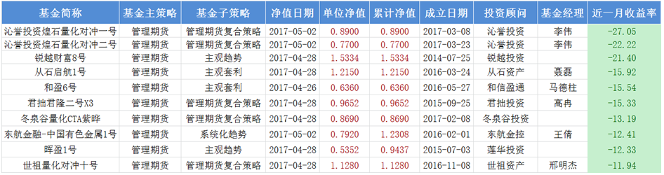 四月排名垫底的10只管理期货策略产品中,月度亏损均超过10%。其中,沁誉投资旗下的“沁誉投资煌石量化对冲一号”和“沁誉投资煌石量化对冲二号”最为惨烈,月度收益分别为-27.05%和-22.22%。锐越投资旗下的“锐越财富8号”月度亏损为21.40%,不过该产品前期有较大的获利,目前净值还在1.5以上。