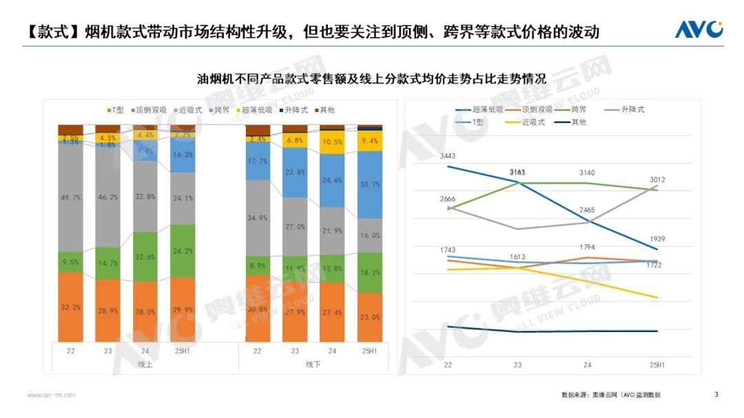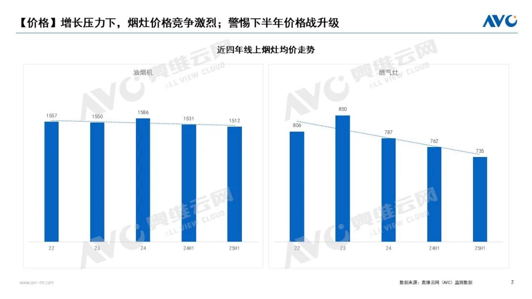 虽然当前烟灶市场整体仍保持较高的增长速度,但行业持续增长的后劲略显疲态。一方面源于国补政策的波动性与去年同期的高基数;另一方面,严重的同质化与突破性创新的缺失限制了换新需求的进一步释放。尤其进入第二季度末行业压力显著增大,在此情况下,行业尤其是线上价格竞争逐渐加码。奥维云网(AVC)监测数据显示:2025年上半年,线上油烟机产品均价1512元、燃气灶产品均价735元,均有明显下滑。从细分市场看,油烟机顶侧双吸、跨界、超薄等升级款式产品价格也有波动,作为近几年烟机市场升级的核心推力,随着价格竞争不断激烈,款式升级带来的拉力正在逐渐减弱。