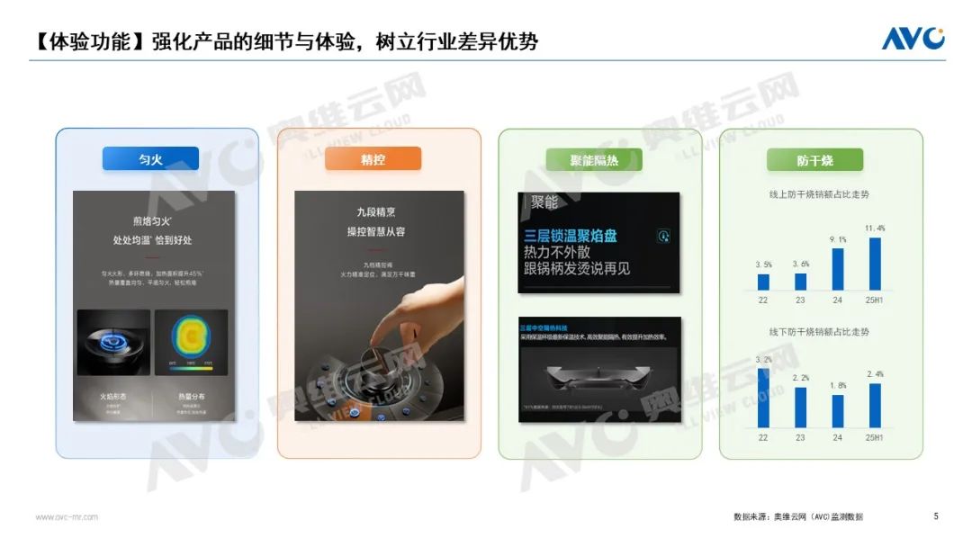 产品体验的加速升级灶具:当高参数成为标配,竞争焦点需转向提升用户体验。奥维云网(AVC)监测数据显示,2025年上半年线上5.2KW及以上产品零售额占比为70% ;63%热效率及以上产品零售额占比为92.5%。在性能差异弱化的背景下,聚焦烹饪体验升级如匀火、精控;聚焦体感优化如聚能隔热;聚焦安全增强如定时、防干烧等功能,正成为新的需求焦点。油烟机:一方面,厨房闷热问题长期困扰用户。结合2025年高温天气及厨房空调的走热趋势,集成制冷功能的油烟机有望成为解决该痛点的重要发展方向。另一方面,健康需求的爆发,未来油烟机“厨房空气管家”的概念也有发展与升级的空间。