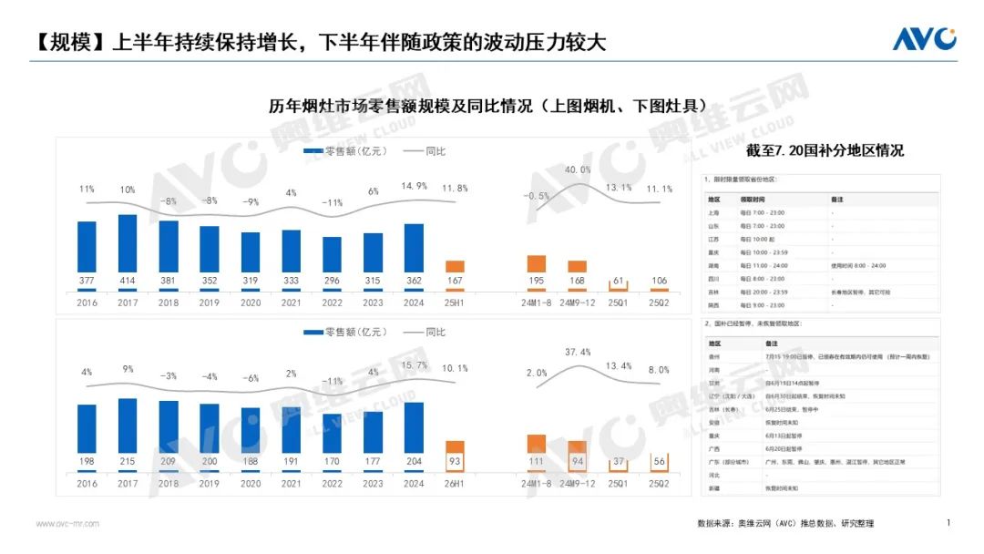 2025年过半,在国家补贴政策持续刺激与品类换新周期利好的双重作用下,烟灶市场交出了“意料之内”的答卷。奥维云网(AVC)推总数据显示,2025年上半年油烟机市场累计零售额167亿元,同比增长11.8%;累计零售量958万台,同比增长10.3%。燃气灶市场累计零售额93亿元,同比增长10.1%;累计零售量1139万台,累计增长8.8%。