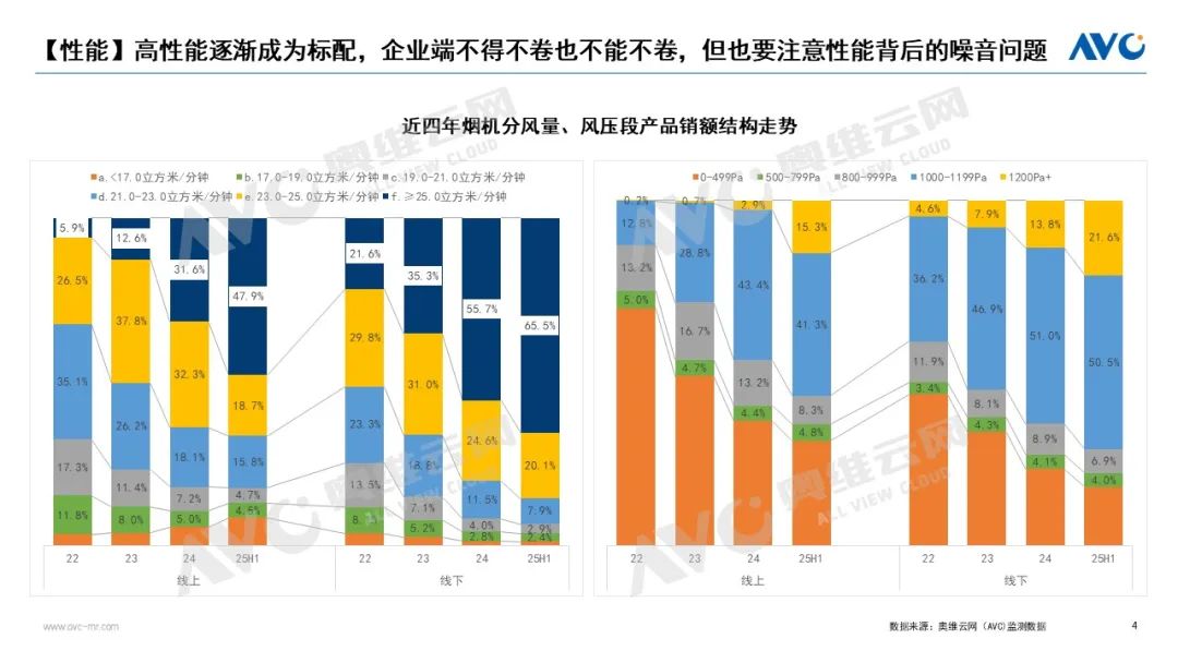 消费者痛点的完全解决现阶段,内卷参数成为市场竞争与产品升级的重要方向,以油烟机为例,奥维云网(AVC)监测数据显示:2025年上半年,线上线下油烟机25m3/min及以上产品零售额占比分别为47.9%与65.5%;线上线下油烟机1200Pa及以上产品零售额占比分别为15.3%与21.6%。性能的跃迁提高了吸排烟效果,但同时也带来了明显的噪音问题,消费者核心痛点并未得到彻底解决。未来,“高性能低噪”这类无短板的产品升级,才是真正契合消费者期待的解决方案。