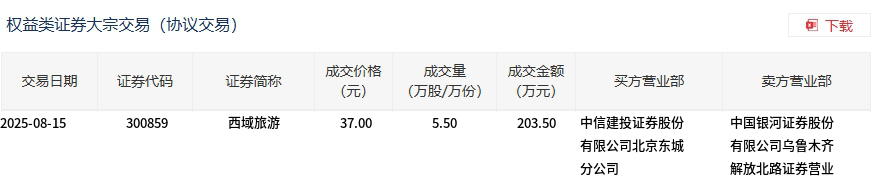8月15日,西域旅游大宗交易成交5.5万股,成交额203.5万元,占当日总成交额的0.4%,成交价37元,较市场收盘价40.57元折价8.8%。