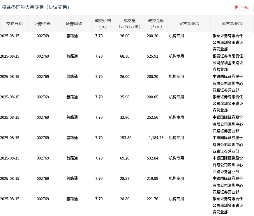 8月15日,普路通大宗交易成交459.45万股,成交额3537.77万元,占当日总成交额的37.04%,成交价7.7元,较市场收盘价8.61元折价10.57%。