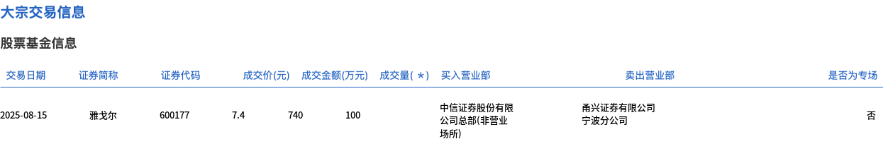 8月15日,雅戈尔大宗交易成交100万股,成交额740万元,占当日总成交额的5.17%,成交价7.4元,较市场收盘价7.44元折价0.54%。