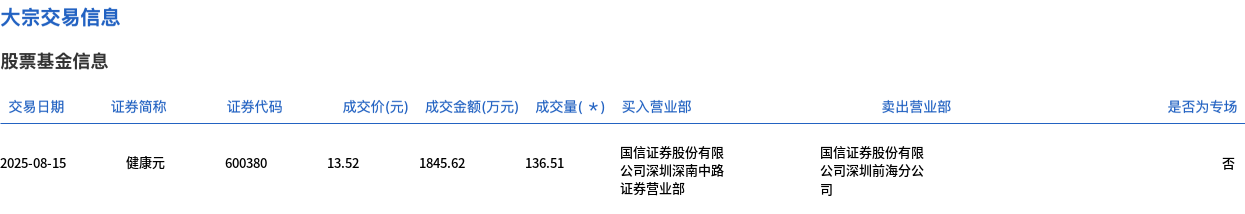 8月15日,健康元大宗交易成交136.51万股,成交额1845.62万元,占当日总成交额的2.54%,成交价13.52元,较市场收盘价13元溢价4%。