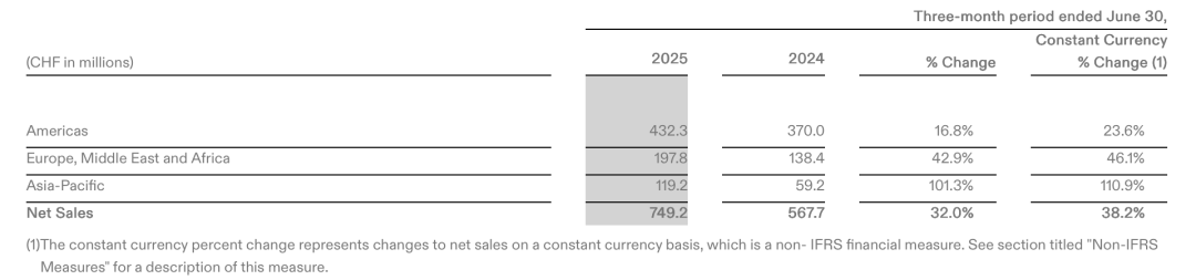 报告期内,昂跑在欧洲、中东和非洲(EMEA)、美洲和亚太地区的净销售额分别增长了42.9%至1.98亿瑞士法郎、16.8%至4.32亿瑞士法郎和101.3%至1.19亿瑞士法郎。