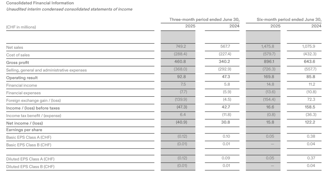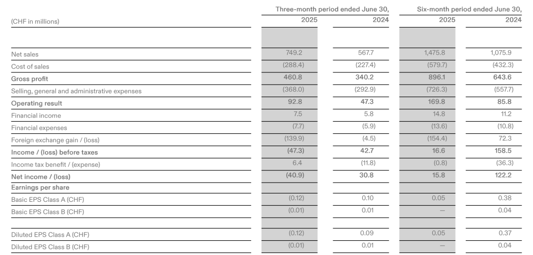 但需要注意的是,从今年的数据看,昂跑的盈利能力不比从前。2025年二季度,在净销售额保持高速增长的情况下,昂跑净利润却大跌232.7%,由去年同期的盈利3080万瑞士法郎转为亏损4090万瑞士法郎;净利率直接由正转负,从5.4%下滑至-5.5%。