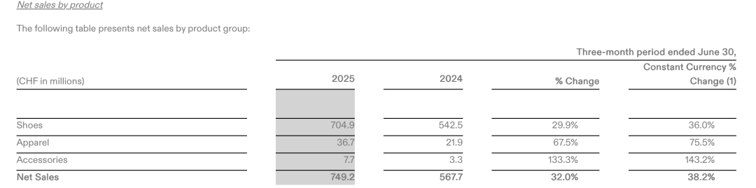 最新财报显示,2025年二季度,昂跑净销售额同比增长32%至7.49亿瑞士法郎,按不变汇率增长38.2%。