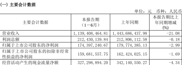 公司在2025年半年度报告中提到,公司在报告期内实现营业收入11.39亿元,同比减少21.08%,营业收入的减少主要是由于本期消肿止痛贴、盐酸倍他司汀注射液、儿童清咽解热口服液等产品及医药批发业务收入下降所致。