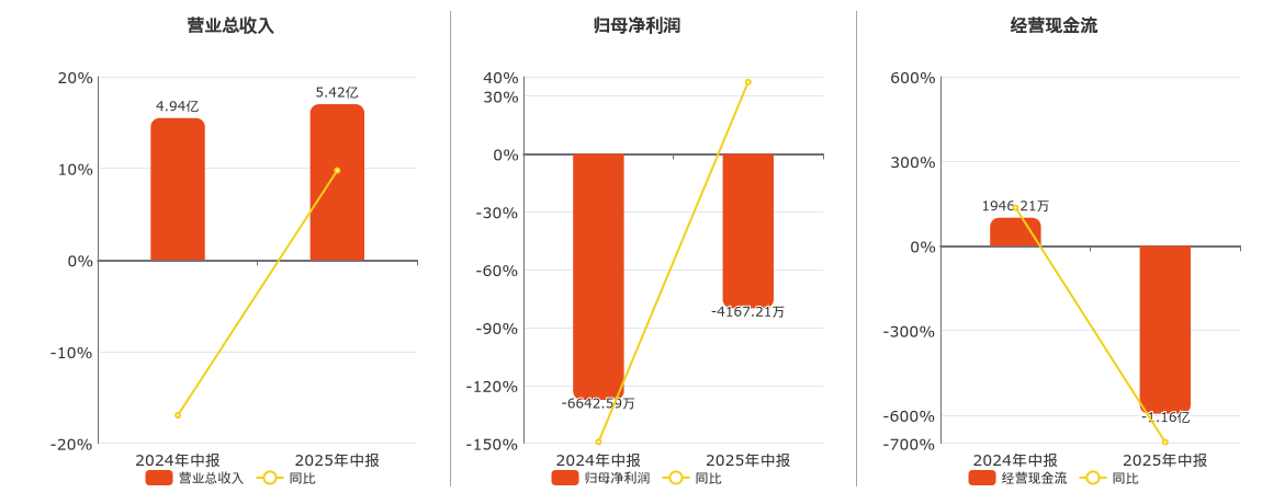 公司营业总收入为5.42亿元。归母净利润为-4167.21万元。经营活动现金净流入为-1.16亿元,较去年同报告期经营活动现金净流入减少1.35亿元,同比较去年同期下降695.76%。