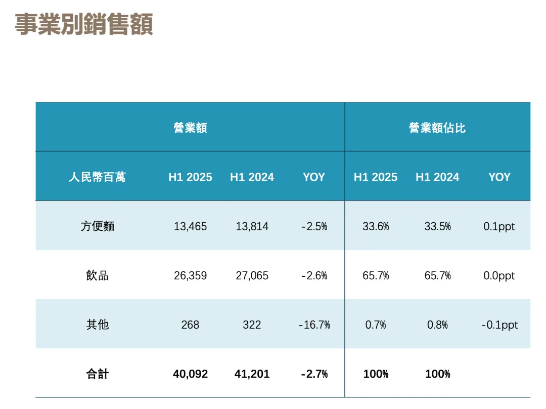 尽管上半年收入同比下降,但康师傅两大业务的利润却均实现了双位数的增长。其中,饮品业务上半年归母净利润同比增长19.7%至13.35亿元,方便面业务归母净利润同比增长11.9%至9.51亿元。