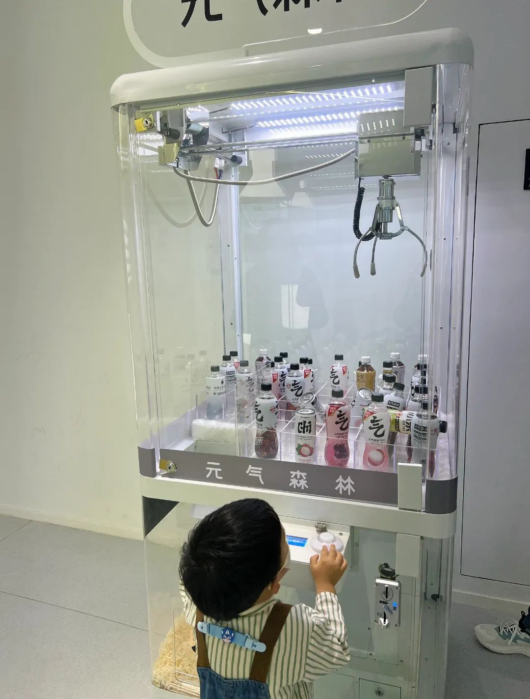 有饮料抓娃娃机、饮料展示墙、还有市面上绝大多数饮料的糖分对比表。