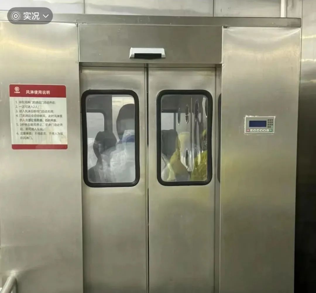 有网友参观正新鸡排工厂车间,在进门之前先被里里外外套上两层防化服,然后塞进双侧隔离的消毒间风淋式消毒,才能进入食品车间。
