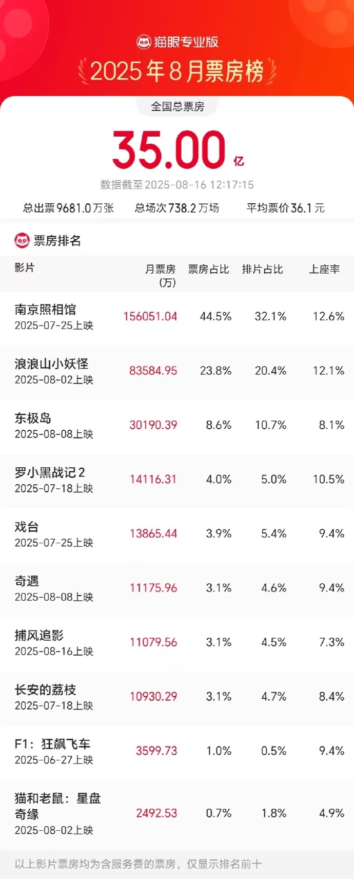 据猫眼专业版数据,8月16日12时17分,2025年8月总票房破35亿,《南京照相馆》持续领跑8月票房榜,《浪浪山小妖怪》《东极岛》分列二三位。