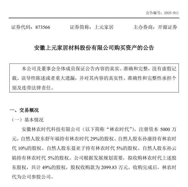 8月15日,上元家居发布公告称,安徽林农时代科技有限公司,注册资本5000万元,主营业务为胶合板、人造板、复合板的生产销售,自然人股东舒年福持有林农时代29%的股权、自然人股东孙康持有林农时代10%的股权、自然人股东聂亚子持有林农时代5%的股权、自然人股东孙云娟持有林农时代5%的股权。公司根据发展规划需要,拟收购林农时代上述股东股权,共计49%的股权,股权收购款为2099.83万元。收购完成后,林农时代为公司参股公司。