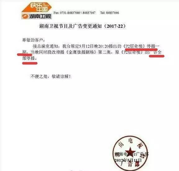 5月12日,湖南电视台广告部发布通知,称“接总编室通知,我台原定5月12日晚20:20播出的《七十二层奇楼》停播一期,当晚同时段改增播《金鹰独播剧场》第二集,原《七十二层奇楼》的广告全部停播”。不久后,节目的官微也及时发布微博,称“本周稍事休整,只为下周解锁全新幻境。制服探秘团早已蓄势待发,下周五20:20探秘之旅挑战继续”。虽有不死心的观众仍在八点守候电视前,却只看到《思美人》的播出,停播一说落下实锤。