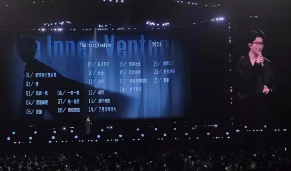 “为了让观众走进他的歌词世界,我们一直在想如何可视化呈现歌词。”刘子夏透露,自己偶然看到一个灯的影子,便灵感突发设计了一个巨大的方形歌词灯。方形歌词灯从观众席上方垂下,歌词投影在观众席间不断流动,浪漫又诗意。