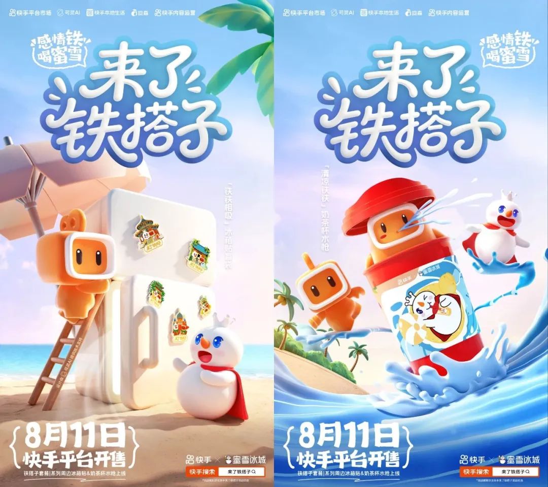 近日,快手与蜜雪冰城再次联名,推出「来了铁搭子」联名套餐。此次联名活动推出多款限定周边,包括冰鲜柠檬水搭配联名杯套、城市限定地标「铁铁相吸」冰箱贴盲袋、「清凉铁铁」奶茶杯水枪等。(social beta)