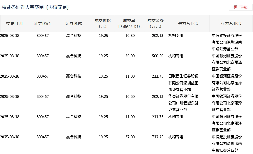8月18日,赢合科技大宗交易成交106万股,成交额2040.51万元,占当日总成交额的2.95%,成交价19.25元,较市场收盘价21.73元折价11.41%。