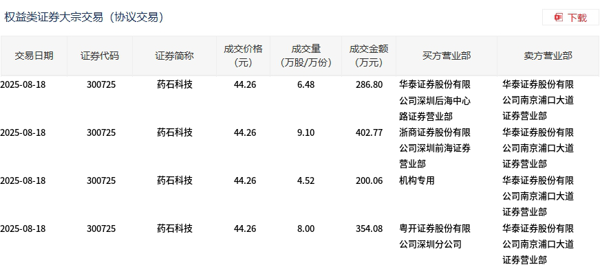 8月18日,药石科技大宗交易成交28.1万股,成交额1243.71万元,占当日总成交额的1.05%,成交价44.26元,较市场收盘价49.92元折价11.34%。