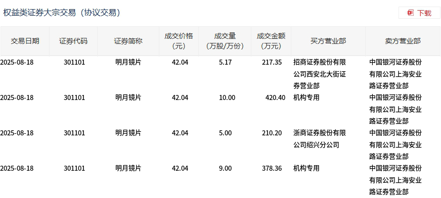 8月18日,明月镜片大宗交易成交29.17万股,成交额1226.31万元,占当日总成交额的2.05%,成交价42.04元,较市场收盘价48.65元折价13.59%。