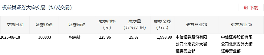 8月18日,指南针大宗交易成交15.87万股,成交额1998.99万元,占当日总成交额的0.13%,成交价125.96元,较市场收盘价125.96元持平。