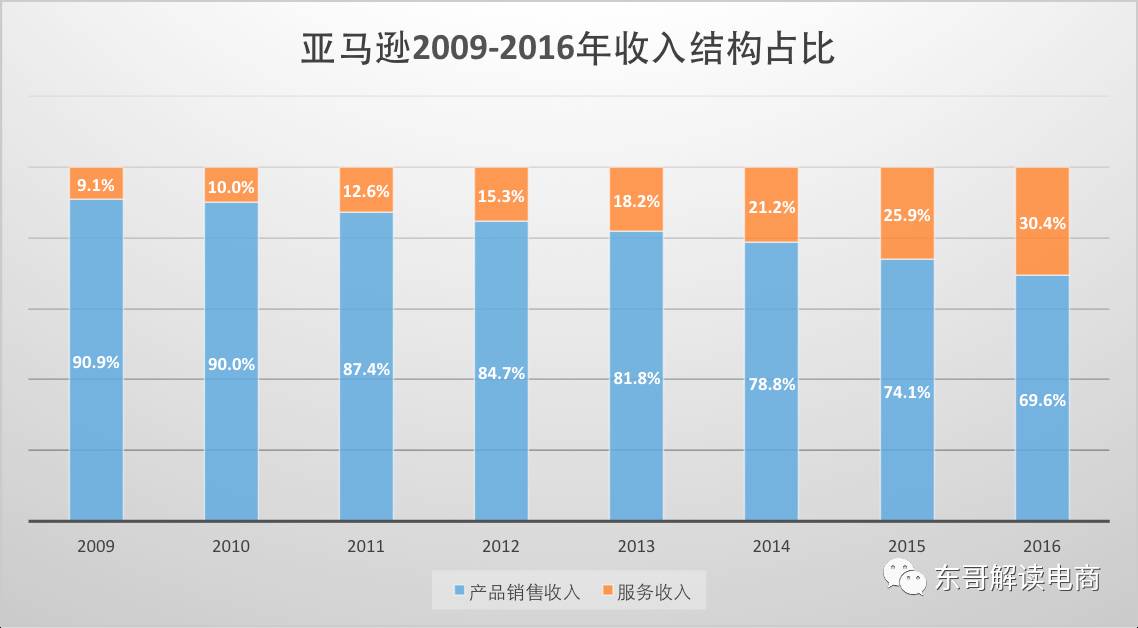 当然,开展新业务并不能迅速马上提升收入。改善毛利润率,需要三五年,甚至更长以上时间。在2011年前,亚马逊商品零售的收入占比依然高达90%,而到了2013年后,包含开放平台佣金和广告、AWS、prime会员的其它高毛利润率收入开始迅速增长,到了2016年其它收入占到了30.4%。