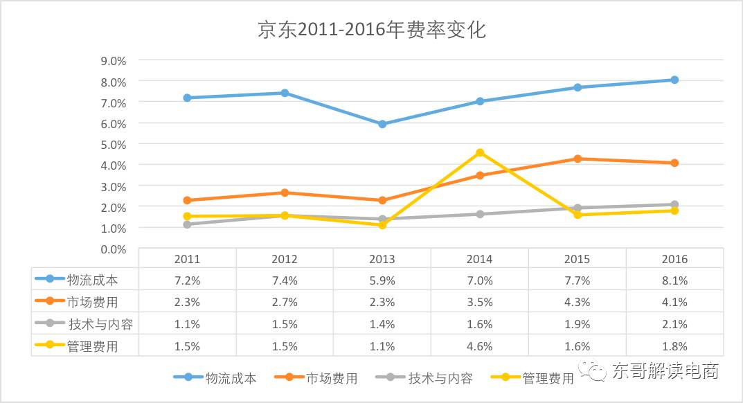 京东毛利润率已进入一个快速上升通道期,每年增长1-2个点并不太奇怪。从业务上,京东最艰难的时刻是2008年-2012年的时候。而从资本市场而言,最艰难的是2015-2016年,京东已不需要再证明自己是否具备盈利能力。