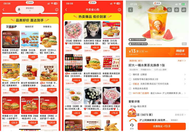 整个快手外卖闭环中,用户不仅需从快手到美团跨平台操作,且相比美团/饿了么“选店→下单→支付→等待配送”的点单方式,还额外增加了核销步骤。
