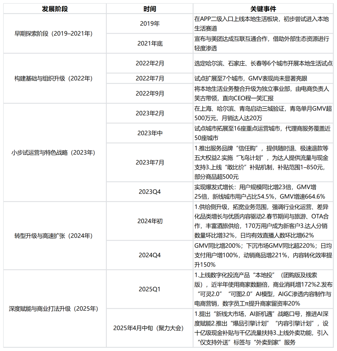 快手外卖并非“从零起步”,而是建立在本地生活业务的基础上。围绕本地生活业务,快手外卖历经五个阶段:早期探索阶段(2019–2021年)、构建基础与组织升级阶段(2022年)、小步试运营与特色战略阶段(2023年)、转型升级与高速扩张阶段(2024年)、深度赋能与商业打法升级阶段(2025年)。