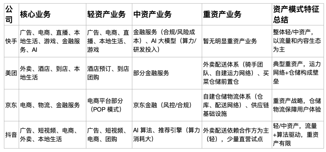 快手自成立以来,主要业务(广告、电商、直播、本地生活、游戏、金融服务、AI)均为平台型/应用型业务,以流量撮合、技术赋能和生态合作为核心,走的是轻/中资产模式。而外卖行业的本质是“重运营”,需深度介入供应链与履约,二者在模式底层存在根本差异: