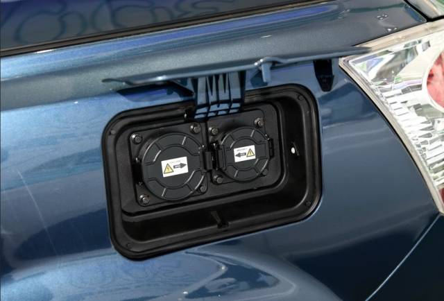 使用电动车最担忧的当然就是充电和续航了。比亚迪e6充电在车屁股处,打开充电口盖板,有两种充电模式。左侧较大的为快速充电接口,15分钟就可以充电80%;右侧较小的是普通充电接口,可以使用普通220V的家用电压。